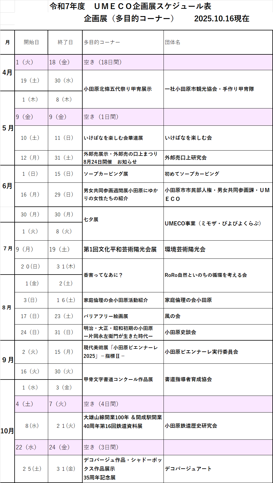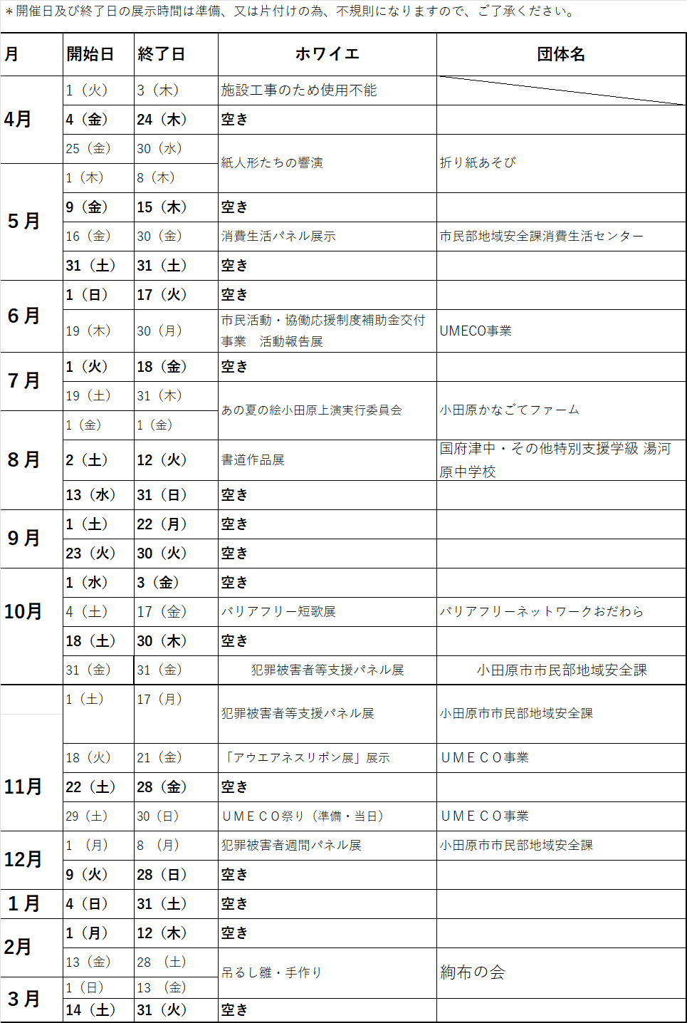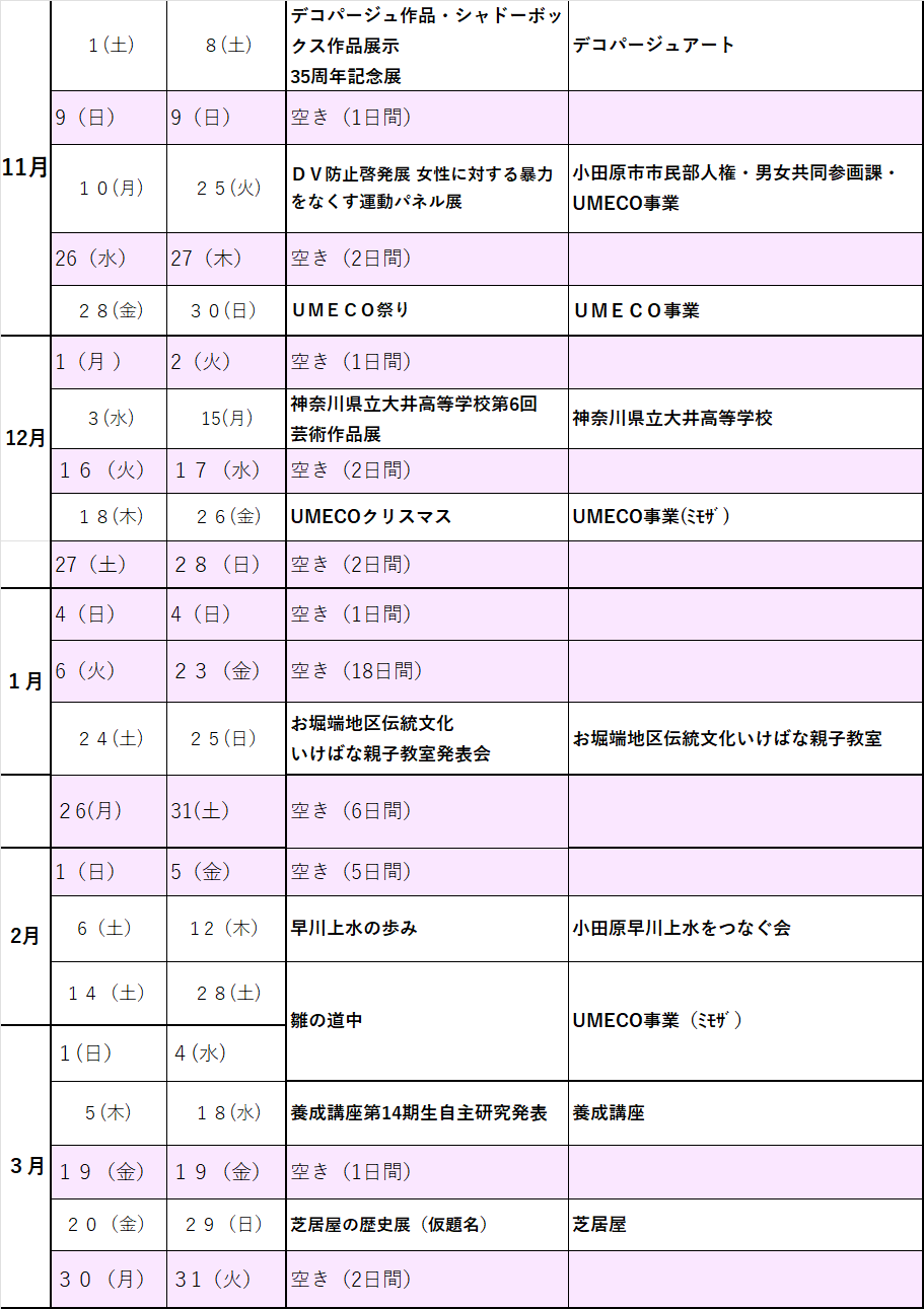 UMECO企画展 年間予約状況カレンダー