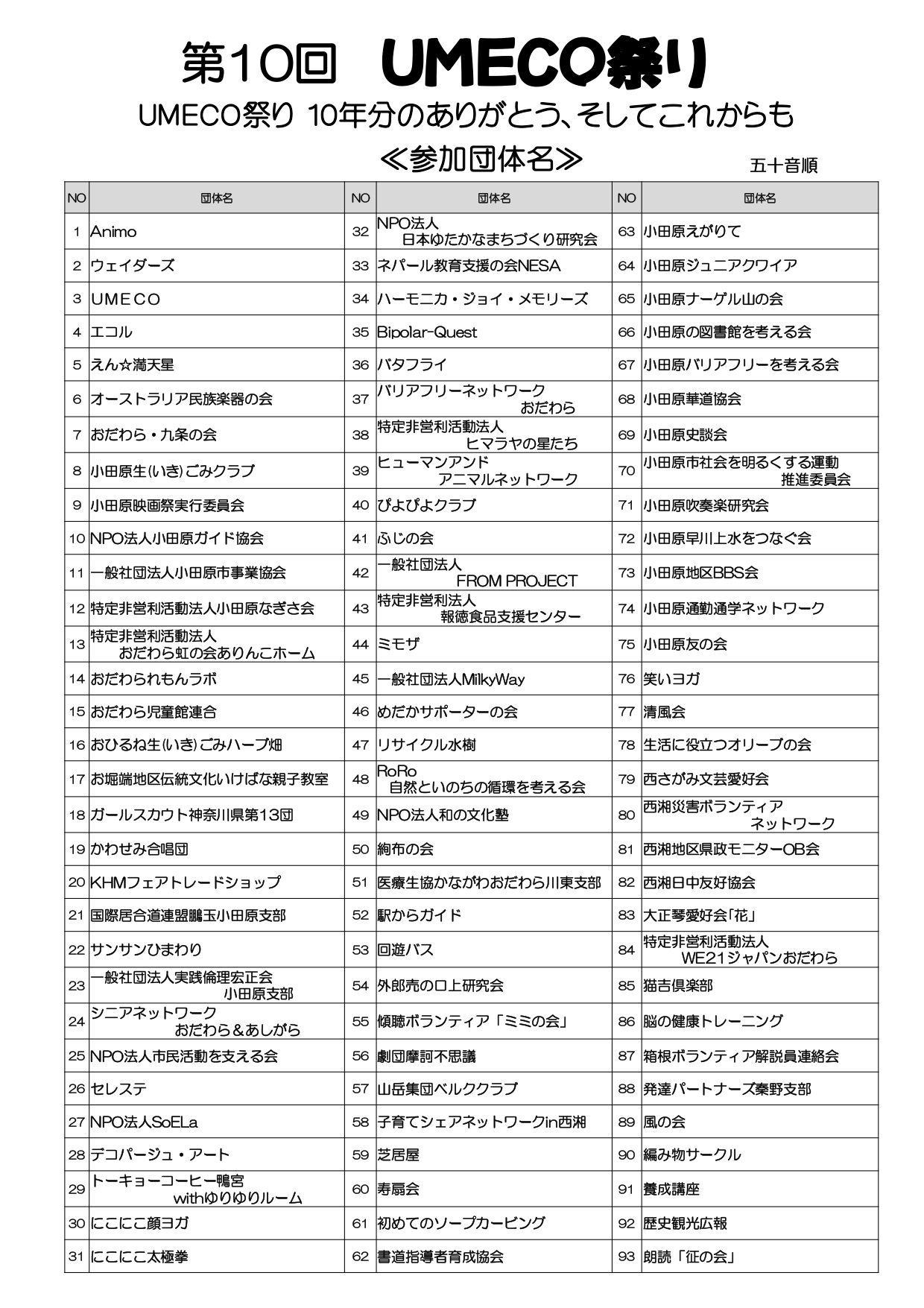 今年は、おだわら市民交流センターUMECOがオープンしてから10年目を迎えます。UMECO祭りも10回目となります。これまでUMECOと何らかの形で関わっていただいた皆さまへの感謝の気持ち、そしてこれからもご贔屓にしていただきたい気持ちを込めて、いつもと違うUMECO祭りをお楽しみに。